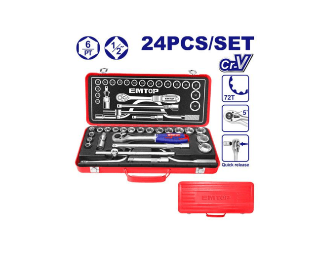 Комплектация: 18 головок 1/2 дюйма Cr-V DR: 10, 11, 12, 13, 14, 15, 16, 17, 18, 19, 20, 21, 22, 23, 24, 27, 30, 32 мм 2 удлинителя 1/2 дюйма DR: 125 мм (5 дюймов) и 250 мм (10 дюймов) 1 скользящая Т-образная рукоятка 1/2 дюйма DR: 250 мм 1 универсальный шарнир 1/2 дюйма DR 1 рукоятка с быстрым храповым механизмом 1/2 дюйма DR (трещотка) Характеристики: Материал: высококачественная Cr-V сталь 50BV30 Рукоятка: мягкая, трехцветная Обработка: микрообработка, хромирование и термообработка Упаковка: металлическая коробка