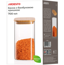 Ardesto AR1370BLS — стеклянная банка серии Fresh для хранения продуктов с крышкой из бамбука. Некоторые характеристики: объём: 0,7 л; размеры: 8 × 17,9 × 8 см; вес: 0,3 кг; можно мыть в посудомоечной машине; подходит для хранения круп, специй, орехов и других продуктов. Страна-производитель: Китай.