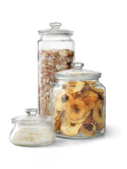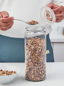 Прозрачная стеклянная банка ёмкостью 1,8 литра с крышкой — удобное и прочное решение для хранения продуктов.