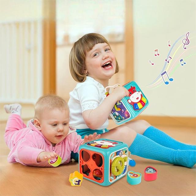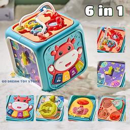 Развивающий кубик для малышей – это настоящий игровой центр! На каждой из 6-ти сторон музыкального кубика малыш найдет что-то очень интересное! Первая сторона – музыкальное пианино в виде коровы с переключателем между режимами виде копытца. При этом пианино, которое находится ниже, светится огнями. Вторая сторона – это яркие шестеренки, и лабиринты. Третья сторона куба – часы, поворачивая стрелки которых, можно изучать цифры и время. Четвертая сторона – руль, поворачивайте и машинка, которая находится выше, будет передвигаться в лево и право. На пятой стороне куба расположены фигурные отверстия, через которые малыш должен протолкнуть внутрь куба фигурные элементы (прилагаются в комплекте). На шестой стороне куба - дверка с крутящимся шариком, открыв которую, можем достать провалившиеся фигуры.