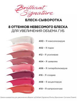 Характеристики Цвет: №400 MAXIMIZE / Я МАКСИМИЗИРУЮ Объем: 7ml Описание Новый ухаживающий продукт для губ: блеск-сыворотка для заметного увеличения объема губ Brilliant Volume Plump. Ухаживающая формула сыворотки с гиалуроновой кислотой увлажняет и наполняет губы влагой на весь день, а трипептид способствует синтезу коллагена кожи. Масло перечной мяты охлаждает губы и заметно увеличивает объем губ. Палитра содержит 8 оттенков с разнообразным финишем от прозрачного до ярко-розового (400, 404, 406 – с мелким шиммером, 402, 408, 410, 412, 416 – с чистым глянцем). Текстура блеска стойкая, не оставляет ощущения липкости, не скатывается и комфортно ощущается на губах. Аппликатор в форме восьмерки позволяет быстро и комфортно нанести сыворотку на губы. Способ применения Нанесите необходимое количество блеска на губы и равномерно распределите. Наносите блеск от центра к краям, чтобы избежать слишком густого слоя в уголках. Для максимального эффекта нанесите двойной слой в центре.