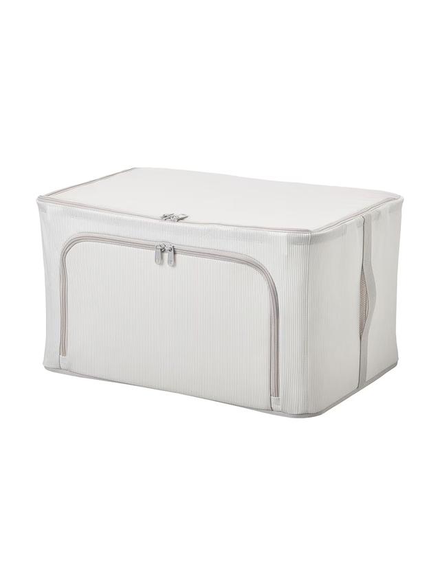 Контейнер для хранения из ткани с полосатым дизайном в бело-сером цвете. Размеры 34x51x28 см. Подходит для хранения одежды, игрушек и других домашних вещей. Легкий и мягкий, его можно сложить, когда он не используется.