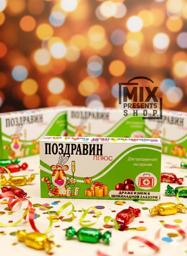 Драже "Поздравин" изюм в шоколадной глазури (80гр) Сладкая аптечка. Прикольный, вкусный и оригинальный подарок для любого повода! Сладкая аптечка всегда придет вам на помощь и поднимет настроение! Размер упаковки: 12 × 6 × 2 см.