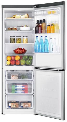 Samsung RB33A32N0SA — двухкамерный холодильник с нижним расположением морозильной камеры и электронным управлением. Некоторые характеристики: Холодильная камера: полезный объём — 230 литров, оснащена четырьмя полками из закалённого стекла, часть которых можно регулировать по высоте. Один выдвижной ящик предназначен для хранения овощей и фруктов. На дверце расположены четыре балкона с увеличенной глубиной, подходящие для высоких упаковок, бутылок и банок. Подсветка — верхняя, светодиодная. Морозильная камера: полезный объём — 98 литров, три глубоких выдвижных ящика позволяют удобно хранить продукты разного формата. Система No Frost исключает образование наледи и ускоряет охлаждение. Поддерживается режим суперзаморозки для свежих продуктов. Мощность замораживания — до 12 кг/сутки. Управление и дополнительные функции: внешняя панель управления в чёрном цвете позволяет настраивать температуру и управлять режимами. Цифровой инверторный компрессор подстраивает мощность под рабочие условия, снижая уровень шума до 37 дБА и расход электроэнергии. Многопоточная система охлаждения обеспечивает равномерное распределение температуры.