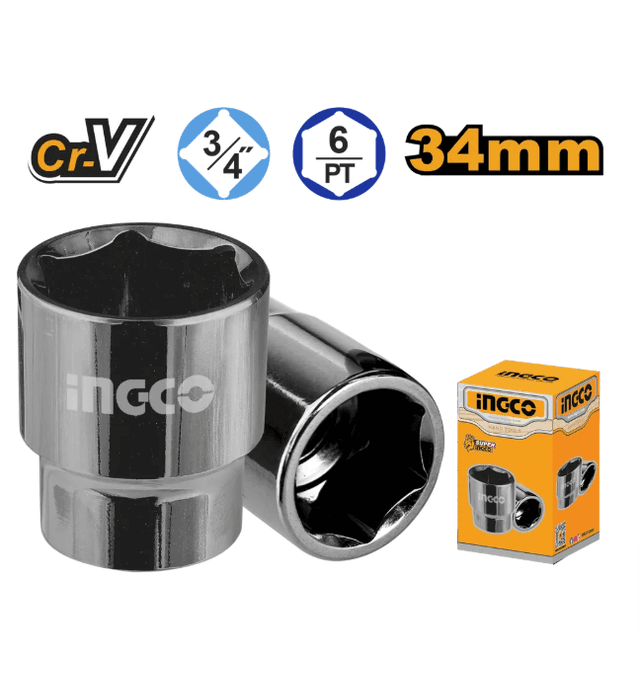 Головка торцевая шестигранная INGCO HHAST34341 INDUSTRIAL 3/4" 34 мм Вес: 0,3 кг. Параметры упакованного товара: Длина - 5 см, Ширина - 5 см, Высота - 7 см