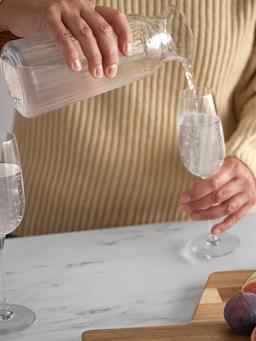 Графин объёмом 1 литр из прозрачного стекла с узором идеально подходит для стильной подачи воды или напитков. Классический дизайн украсит любой стол.