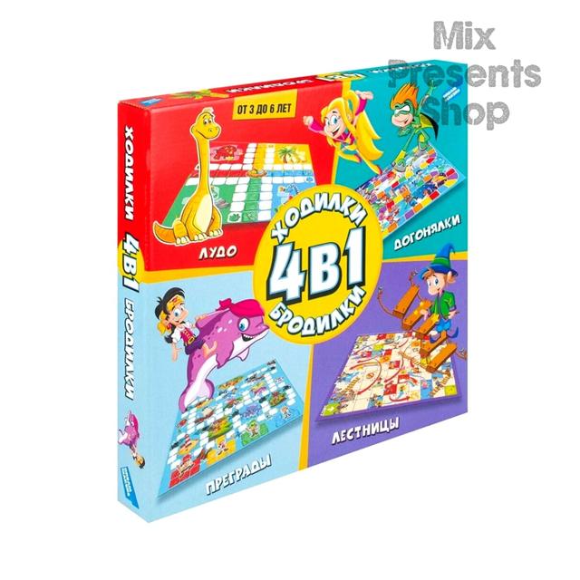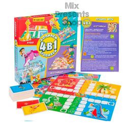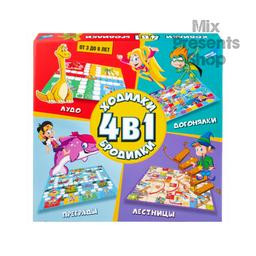 "Ходилки-Бродилки 4 в 1" это первые игры, которые откроют вашему ребёнку увлекательный мир настольных игр! Все игры коллекции просты в освоении и в процессе игры помогут легко и весело провести время в кругу семьи поощряя общение. Игры помогут родителям в организации детского праздника и смогут надолго оторвать ребёнка от компьютера или телевизора, ведь внутри коробки содержится 4 разных игры. Простые правила позволят детям быстро освоить игры и начать играть самостоятельно без помощи взрослых или при их минимальном участии. Коллекция содержит проверенные временем лучшие классические механики «ходилок-бродилок» для детей в современном дизайне на популярные сегодня детские темы. Особенности: 4 увлекательных игры в одной коробке (Догонялки, Лудо, Лестницы, Преграды); подходит для малышей и дошкольников; качественные иллюстрации на полях, современный дизайн. Количество игроков: 2-4. Время партии: около 15 минут.