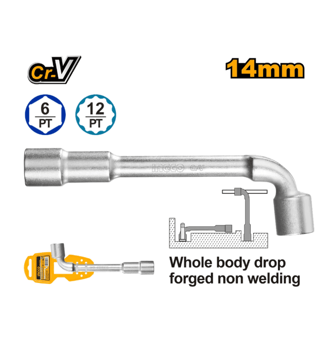 Ключ торцевой изогнутый INGCO HWL1408 INDUSTRIAL 14 мм применяется для работ со шпильками и другими длинными резьбовыми элементами. Благодаря различной длине сторон можно использовать для заглубленных или тугих болтов. Инструмент выполнен из высокопрочной хромованадиевой стали. Наличие отверстия в головке торцевого L-образного ключа позволяет откручивать гайки с длинными шпильками. Размер головки: 14 мм Материал: Cr-V Цельная структура, кованый металл Покрытие: матовое хромирование Уровень качества, аналогичный FACOM