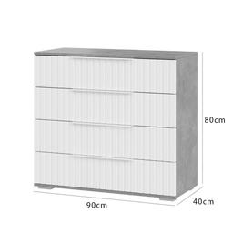 Вместительный комод с комбинированным фасадом (Серый/Белый) Этот комод сочетает в себе современную эстетику и высокую функциональность, идеально подходя для спальни, гостиной или детской комнаты. Корпус выполнен в стильном сером цвете с выраженной текстурой, который гармонично контрастирует с белыми фасадами из МДФ. Четыре ящика разного размера обеспечивают удобное хранение как объемных вещей, так и мелких аксессуаров. Оригинальные металлические ручки и устойчивые ножки завершают современный образ модели, делая её не только практичной, но и легкой в уходе. Характеристики: Материал корпуса: ЛДСП (Цвет: Серый текстурный). Материал фасадов: МДФ (Цвет: Белый). Конструкция: 4 выдвижных ящика разного размера. Фурнитура: Оригинальные металлические ручки. Особенности: Установка на ножки для удобства уборки. Размеры: Высота: 80 см. Ширина: 90 см. Глубина: 40 см. Доставка и установка: Бесплатно по городу Ашхабад.