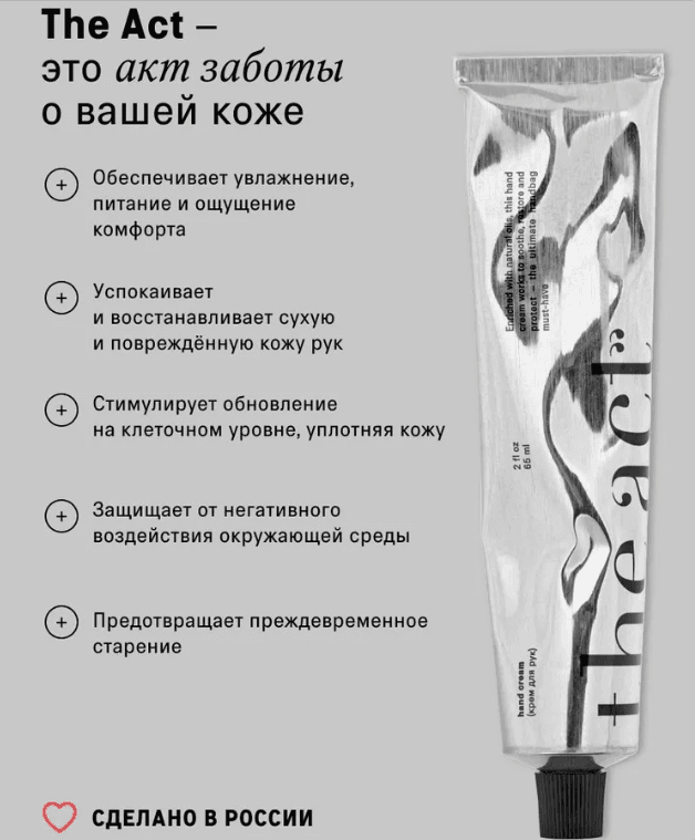 Лёгкий, быстро впитывающийся крем с прозрачным ароматом белых цветов и чистоты деликатно ухаживает за кожей рук, обеспечивая глубокое увлажнение, питание и восстановление. Ламеллярная структура крема позволяет ему мгновенно впитываться, не оставляя липкой плёнки, а удобный формат в стильной алюминиевой тубе делает его незаменимым спутником в уходе за руками. — увлажняет, питает — регенерирует — укрепляет естественный защитный барьер кожи, помогая ей противостоять негативному воздействию окружающей среды — восстанавливает — оказывает омолаживающее и ревитализирующее действие Объём 65 мл