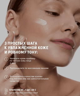 Увлажняющий крем-праймер для лица с гиалуроновой кислотой и натуральными экстрактами выравнивает цвет и текстуру кожи, маскирует поры и мелкие морщинки, усиливает естественное сияние кожи, комфортно распределяется и продлевает стойкость макияжа. — защищает от UVA и UVB излучения (SPF 15) — создаёт эффект здорового сияния — выравнивает текстуру кожи, маскируя поры и мелкие морщинки — продлевает стойкость макияжа и способствует комфортному нанесению — защищает от факторов окружающей среды и агрессивных воздействий косметики — содержит комплекс из четырёх видов гиалуроновой кислоты и церамидов, которые эффективно удерживают влагу в коже и укрепляют защитный барьер Объём 65 мл