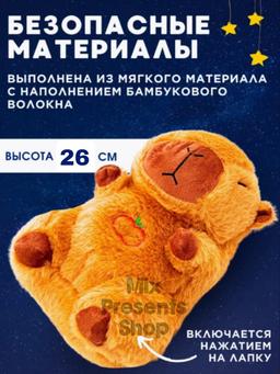 Мягкая дышащая игрушка "Капибара" для сна 26см Дышащая мягкая игрушка "Капибара" лучший друг для сна! Создайте атмосферу уюта и покоя с мягкой дышащей капибарой! Эта очаровательная плюшевая игрушка имитирует дыхание, светится и играет мелодии, помогая малышу быстрее засыпать и чувствовать себя в безопасности. Мягкость и комфорт для вашего малыша Изготовленная из нежного плюша, игрушка идеально подходит для объятий. Ее приятная текстура успокаивает ребенка, создавая ощущение уюта и защищенности. Музыкальный и световой режим Капибара исполняет нежные мелодии до 30 минут, наполняя комнату спокойствием и гармонией. Мягкое свечение делает ее отличным ночником, создавая уютную атмосферу. Реалистичное дыхание Игрушка ритмично двигает животиком, имитируя дыхание настоящего питомца. Это помогает малышу чувствовать спокойствие, словно рядом настоящий пушистый друг. Идеальный подарок для малышей и детей постарше