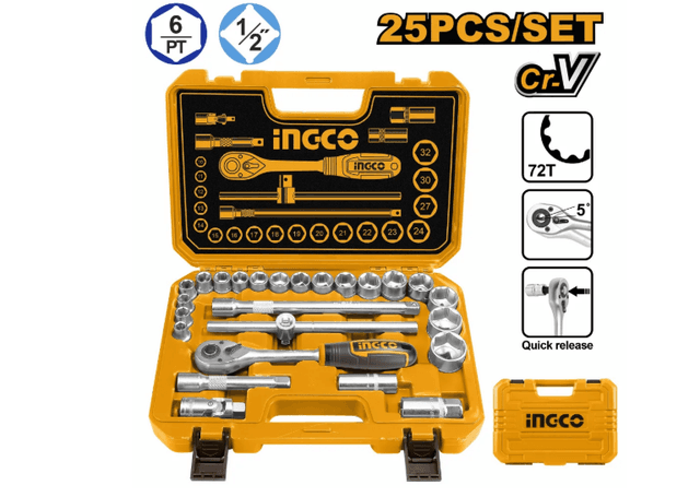 Набор головок 1/2" с трещоткой 25 шт В наборе: Ключ трещоточный 1/2" 45Т: 1шт Торцевые головки шестигранные 1/2" DR 18шт: 10, 11, 12, 13, 14, 15, 16, 17, 18, 19, 20, 21, 22, 23, 24, 27, 30, 32мм Универсальный шарнир 1/2": 1шт Удлинительная насадка 125мм и 250мм 1/2": 2шт Свечные головки 16мм и 21мм: 2шт Т-образный вороток с ползунком 250мм 1/2": 1шт Материал: Cr-V (50BV30), термообработка Упаковка: пластиковый кейс