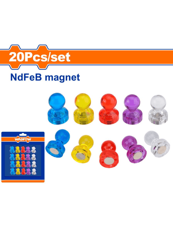 20 шт. цветных магнитных значков для карт в ассортименте. Сверхсильные неодимовые (NdFeB) магниты. Размер: диаметр 11x17 мм. Упаковано в блистер.