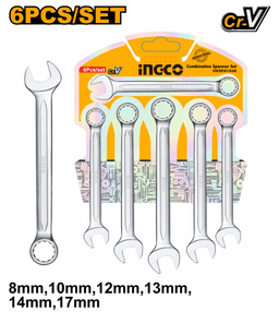 Набор из 6 комбинированных гаечных ключей. С одной стороны — рожковый ключ, с другой — накидной. Подходят для стандартных монтажных и ремонтных работ. Характеристики: Тип ключей: Комбинированные (рожковый + накидной) Количество: 6 штук Размеры: 8 мм, 10 мм, 12 мм, 13 мм, 14 мм, 17 мм Материал: Хром-ванадиевая сталь (Cr-V) Обработка: Полированное покрытие Упаковка: Пластиковый держатель