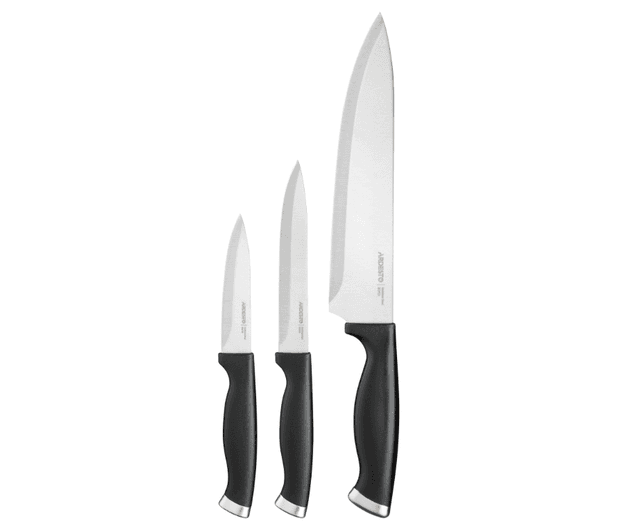 Ardesto Gemini Gourmet AR2103BL — набор из трёх кухонных ножей, которые подходят для профессионального использования и повседневного приготовления пищи. Характеристики: Универсальный нож — длина лезвия 127 мм, подходит для широкого спектра задач на кухне, в том числе для нарезки фруктов и овощей, мяса или рыбы. Поварской нож — длина лезвия 203 мм, используется для нарезки крупных продуктов, мяса или приготовления пиццы. Нож для овощей/чистки — длина лезвия 89 мм, компактное и удобное решение для нарезки маленьких продуктов, очистки овощей и фруктов. Материалы: лезвия — из нержавеющей стали 3CR13, ручки — из пластика. Цвет: чёрный. Страна-производитель: Китай.