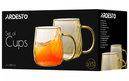 Ardesto AR2635GG — набор из двух чашек Golden Moon объёмом 350 мл. Характеристики: материал: боросиликатное стекло; назначение: для чая, бульона, латте, капучино, эспрессо, кофе, глинтвейна, американо; высота: 8 см; диаметр: 7,5 см; дизайн: геометрический; упаковка: картонная коробка; особенности: можно мыть в посудомоечной машине. Страна-производитель: Китай.