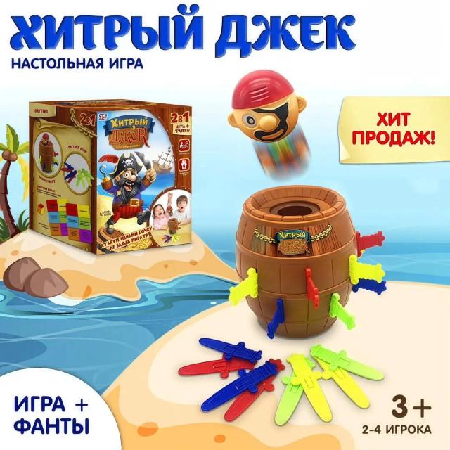 Веселая и непредсказуемая игра на удачу, которая станет хитом любой детской вечеринки или семейного вечера. Главный герой — пират Джек, спрятавшийся в бочке, который может выпрыгнуть в любой момент! Особенности: Элемент сюрприза: Никто не знает, какой именно укол саблей заставит пирата взлететь на воздух — механизм каждый раз срабатывает случайным образом. Простые правила: Понять суть игры можно за 10 секунд, что делает её идеальной для детей от 3 лет и старше. Развитие навыков: Игра помогает малышам развивать мелкую моторику, координацию движений и терпение. Командный азарт: Подходит для компании от 2 до 4 человек, обеспечивая быстрые и эмоциональные раунды. Надежность: Прочная пластиковая конструкция работает без батареек, поэтому игра всегда готова к началу.