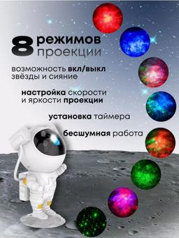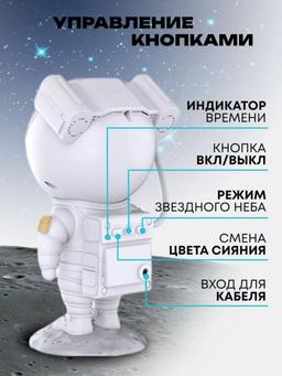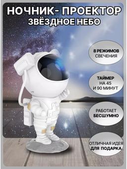 Детский ночник астронавт это настоящий домашний планетарий у Вас дома! Мини проектор космонавт с пультом управления подарит космос в детской, спальне или гостиной. Ночник-светильник для сна поможет ребенку успокоиться перед сном и погрузится в мир грез и волшебства. Ночник проектор можно использовать, как освещение для дома, он наполнит комнату мягким сиянием и космической атмосферой. Светодиодный ночник отлично подойдет в уютный дом для интерьера. Ночник-светильник имеет автоматический режим туманности, так же цвет можно задать в ручную. Ночник космонавт идеальный подарок для детей и взрослых, на день рождения или просто так без повода просто порадовать. В комплект поставки входит: светильник-ночник с подставкой, пульт ДУ и провод UЅВ БЕЗ АДАПТЕРА. Лазерный проектор управляется как с кнопок на самом устройстве, так и с пульта дистанционного управления (есть в комплекте) . Ночник детский работает от блока питания (например, телефона, ноутбука) или повербанка. Угол проецирования у проектора звездное небо можно регулировать. Размер: 24 см