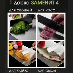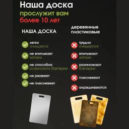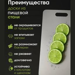 Современная и гигиеничная альтернатива деревянным и пластиковым доскам. Изготовлена из пищевой нержавеющей стали, что делает её идеальным выбором для долговечного использования на кухне. Особенности: Абсолютная гигиеничность: Поверхность не имеет пор, поэтому не впитывает запахи и не накапливает бактерии. Долговечность: Не трескается, не деформируется и не портится от влаги или горячей посуды. Легкий уход: Легко моется и мгновенно сохнет, можно использовать в посудомоечной машине. Универсальность: Подходит для нарезки любых продуктов, а также для раскатки теста (оно не прилипает к холодному металлу). Эстетика: Стильный дизайн, который подчеркивает современный интерьер кухни.