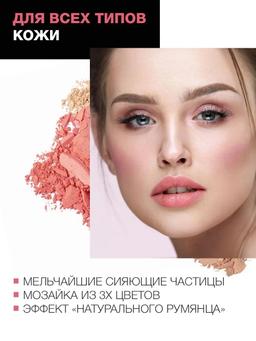 Характеристики Цвет: №010 DOLCE VITA Объем: 5.5gr Описание Мультицветные румяна с сияющими частицами дарят коже привлекательное, деликатное сияние. Три цвета складываются в изящную мозаику и при смешении создают нежный, естественный оттенок. Идеальное средство для сияющего, натурального макияжа с эффектом «подсвеченной изнутри» кожи. Способ применения Нанесите небольшое количество румян, улыбнитесь, это лучший способ найти на щеках правильные участки для нанесения румян. Слегка коснитесь зоны «яблок» на щеках и двигайтесь по направлению к уху, интенсивность цвета регулируйте самостоятельно.