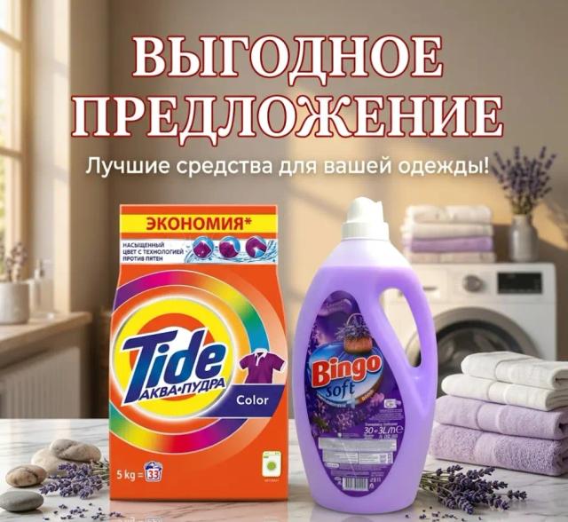 Этот мощный дуэт обеспечит безупречную чистоту и уютный аромат вашим вещам. Стиральный порошок Tide Color (5 кг) глубоко проникает в волокна ткани, эффективно удаляя сложные пятна и сохраняя яркость цветной одежды. Ополаскиватель Bingo "Lavender" (3 л) придает белью невероятную мягкость, облегчает глажку и наполняет дом успокаивающим ароматом лавандовых полей.