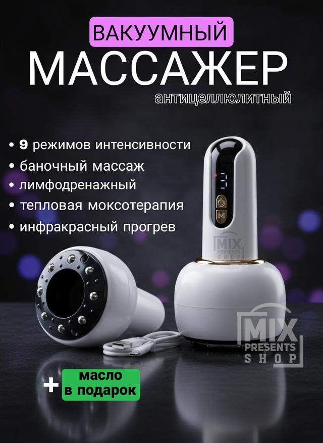 Вакуумный антицеллюлитный массажер — эффективный прибор для домашнего моделирования контуров тела, работающий по принципу создания перепада давления (вакуума). Он усиливает лимфодренаж, уменьшает отеки, улучшает кровообращение и разглаживает «апельсиновую корку». • 9 режимов интенсивности вакуума. • Стимулирует расщепление жировых отложений, повышает упругость кожи, борется с растяжками. • Модель оснащена функцией инфракрасного прогрева для глубокого воздействия. • Идеально подходит для бедер, ягодиц, живота и плеч. Использование: Требует нанесения массажного масла для легкого скольжения. (Масло есть в комплекте) Заряжается от кабеля USB (есть в комплекте)