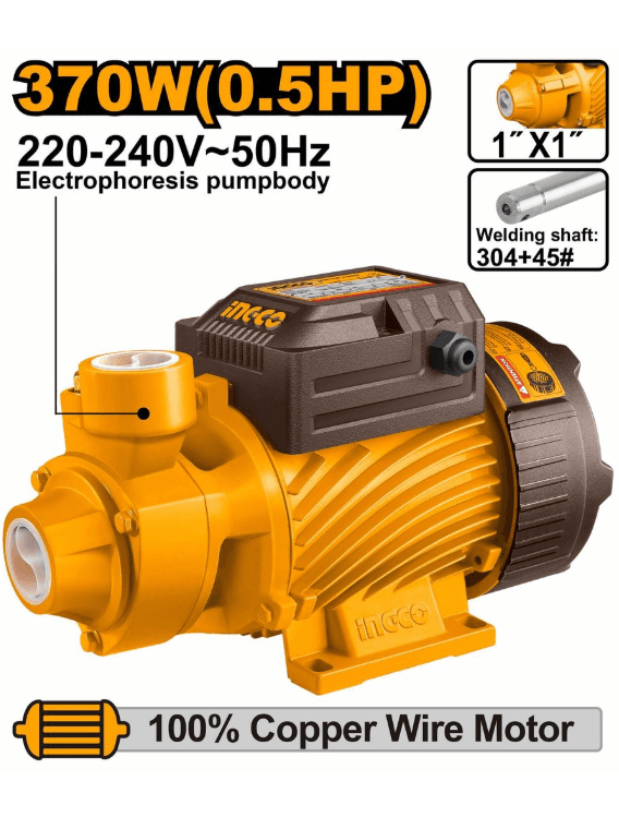 Периферийный насос Напряжение: 220-240 В ~ 50 Гц Номинальная мощность: 370 Вт (0,5 л.с.) Макс. напор: 38 м Макс. расход: 36 л/мин Макс. всасывание: 8 м Диаметр трубы: 1"x1" Двигатель из медной проволоки Сварной вал из нержавеющей стали: 304+45# Корпус насоса для электрофореза Латунная крыльчатка Кабель длиной 0,3 м Упаковано в цветную коробку