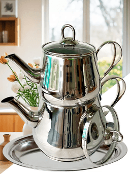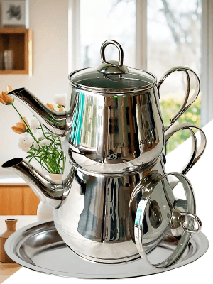 Турецкий двойной чайник из нержавеющей стали. Чайники нижний для кипячения воды 3 литра. Заварочный чайник верхний 1,5 л. ний 1,2 л. Параметры нижнего чайника: вес- 650 гр. объем-3 л. диаметр дна-16 см. высота-14 см. Параметры верхнего чайника: вес- 356 гр. объем-1,5 л. диаметр дна-12 см. высота-12 см.