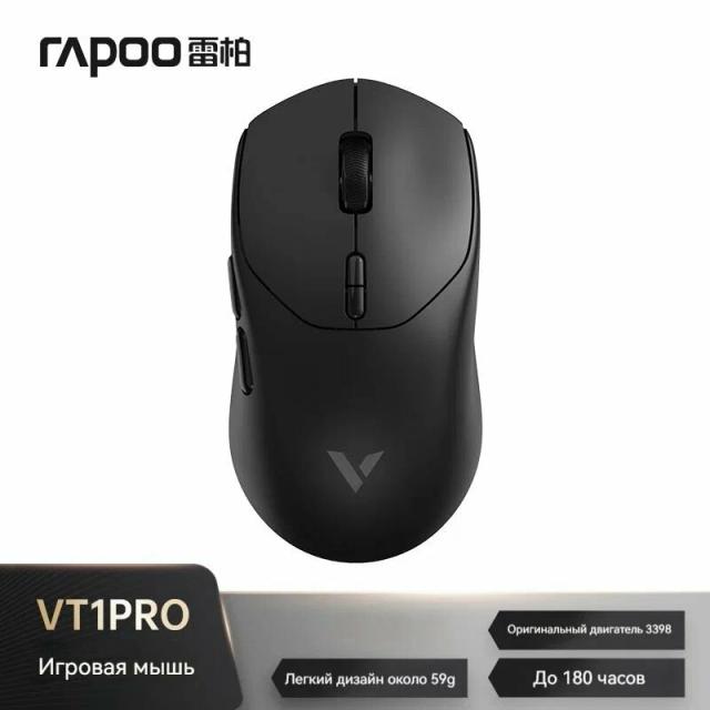 Rapoo VT1PRO — iki görnüşli birikmäni goldaýan (simli we simsiz) ýokary hilli oýun syçanjygy. Takyk sensor, pes yza galma we döwrebap gara‑ak dizaýn oýunçylara ýokary derejeli rahatlyk we durnuklylygy berýär. Ergonomik gurluş uzak oýun seanslarynda eli ýadatmaýar. Artykmaçlyklary Iki birikme görnüşi — USB simli we simsiz ulanyş. Takyk optiki sensor — durnukly we dogry hereket yzarlama. Pes yza galma — tiz we takyk jogap. Ergonomik forma — amatly tutuş we rahatlyk. Gara/Ak dizaýn — döwrebap we özüne çekiji görnüş. Rapoo hil derejesi — berk we uzak ömürli gurluş. Aýratynlyklary Týip: oýun syçanjygy Birişme: USB simli + simsiz Sensor: optiki Reňk: gara + ak Model: VT1PRO