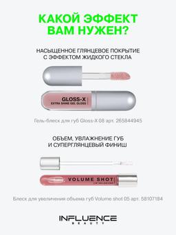 Aýratynlyklary Reňk: №08 COSMIC DUST / БЕЖЕВЫЙ НЮД Göwrümi: 3.4ml Düşündiriş Gloss-X, dodaklara ajaýyp ýalpyldawuk täsir etmek üçin nemlendiriji Gel bleskdir. “Smart Gel” tehnologiýasy elastik gel gurluşyny üpjün edýär. Formulanyň kömegi bilen "akylly" ýalpyldawuk deriniň üstünde deň paýlanýar, dodaklary gurşap alýar, çatryklary we inçe gyrmalary doldurýar, ýelmeýän duýgysyz ajaýyp ýalpyldawuk täsir döredýär. Futuristik tertipli çüýşede gaplanýar we ajaýyp paýlamak üçin uzyn we ýumşak dykyzlary bar. Ulanyş tertibi Dodak makiýažyny döretmek üçin ulanyň. Aplikator ýa-da çotga bilen çalyň.