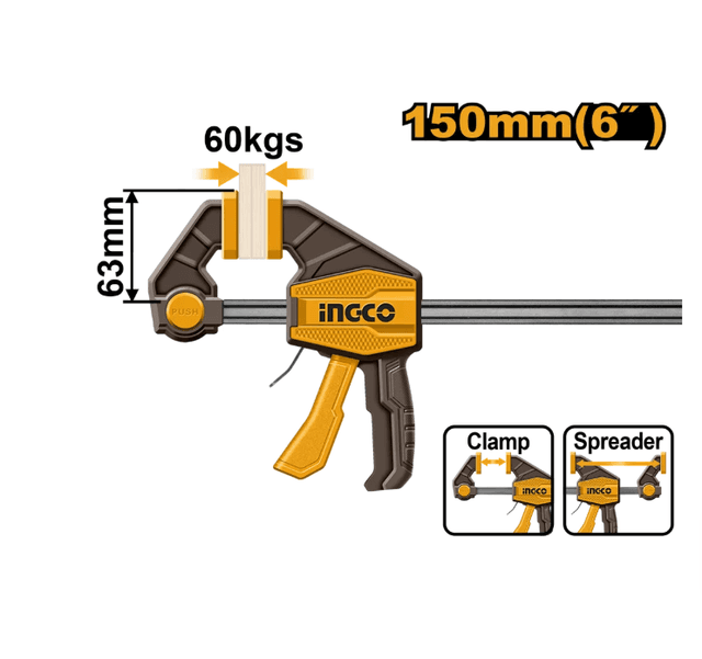 INGCO 63x150 mm HQBC01601 çalt gysyjy gysgyjy (strubsina), şaýlary berkitmek üçin amatly guraldyr. Daýanç gysgyjy tutawaç arkaly ugruşdyryjynyň bütin uzynlygy boýunça süýşürilýär we berkidilýär, şeýle hem ony ugruşdyryjynyň beýleki ujuna geçirip bolýar, bu bolsa gysgyjy "açmak" (kerçetmek) üçin ulanmaga mümkinçilik berýär. Maksimal güýji: 580 N Gysgyjyň görnüşi: çalt gysyjy Niýetlenişi: agaç we metal üçin Gysyş çuňlugy: 63 mm Ramasynyň malzemesi: polat Gysyş giňligi: 150 mm Netto agramy: 0.365 kg