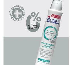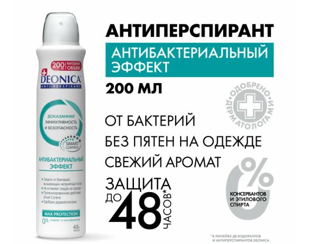 Deonica for Women «Antibakterial täsir» dezodorant-antipirspiranty 48 sagadyň dowamynda derden we ýakymsyz ysden ýokary derejeli goragy üpjün edýär. Antibakterial komponentli ýörite formulasy derini gyjyndyrman, ysyň sebäbi bolan bakteriýalara garşy netijeli göreşýär. Serişde çalt guraýar, geýimde yz galdyrmaýar we uzak wagtlap arassalyk duýgusyny berýär. Düzüminde spirt we parabenler ýokdur. Dermatologlar tarapyndan makullanan. Göwrümi: 200 ml.