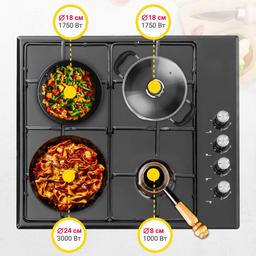 Garaşsyz konfigurasiýaly gaz paneli. Ýokarky örtügi emal, mehaniki dolandyryş we 4 ot ýakýan bar. Ot ýakmak düwmesi (düwme) bilen enjamlaşdyryldy.