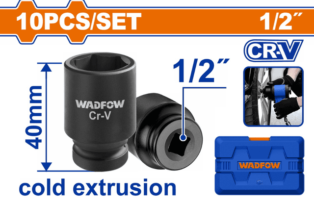 10 sany 1/2"DR urgy golowka toplumy Ölçegleri: 10, 12, 13, 14, 15, 17, 19, 21, 22, 24 mm Materialy: Cr-V (hrom-wanadiý) Termiki işlenilen BMC (plastik keys) gutuda gaplanan