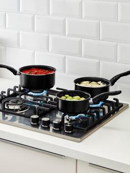 Bu 3 bölekli gara reňkli sous kastrul toplumy 1L, 1.5L we 2L göwrümli gazanlardan ybaratdyr. Aşgazanda gündelik ulanmak üçin amatlydyr — sous taýýarlamak, ýylatmak ýa-da kiçi göwrümli naharlar bişirmek üçin peýdalydyr. Alçak we ulanmak aňsat, ýylylygy çalt paýlaýar.