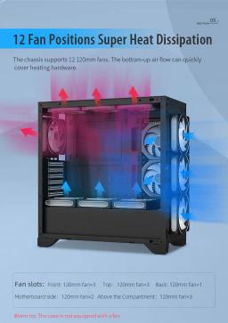 Modeli: GX750A Predator Metal ölçegi: L430 × W218 × H435 mm Korpus ölçegi: L465 × W218 × H461 mm Korpus reňki: Gara Metal materialy: SPCC 0,6 mm Ene plata (M/B): ATX / M-ATX / Mini-ITX Saklaýyş: 2 × 3.5" HDD / 1 × 2.5" SSD Tok üpjünçiligi (PSU): ATX CPU sowadyjy beýikligi (çäklendirme): 165 mm çenli Wideo kartanyň uzynlygy (çäklendirme): 415 mm çenli PCI-E slot: 7 I/O portlary: 1 × USB 3.0 + 2 × USB 2.0 + HD Audio Sistem sowadyjylary: Ýokary bölek: 3 × 120 mm Öň bölek: 3 × 120 mm Yzky bölek: 1 × 120 mm Gapdal bölek: 2 × 120 mm Içki bölek: 3 × 120 mm Gutynyň ölçegi: L513 × W280 × H546 mm Esasy aýratynlyklary: Mesh (tor görnüşli) dizaýn Ýokary bölekde 360 mm suwuk radiator goldawy 12 sanyna çenli sistem sowadyjy goldawy