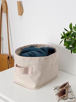 Dokmadan tikilen saklaýyş sebedi, bej reňkde, 25x20x20 sm ölçegde. Ownuk eşikler, oýunjaklar ýa-da öý esbaplaryny tertiplemek üçin amatly. Ýumşak, ýeňil we aňsatlyk bilen göçürilip bolýar.