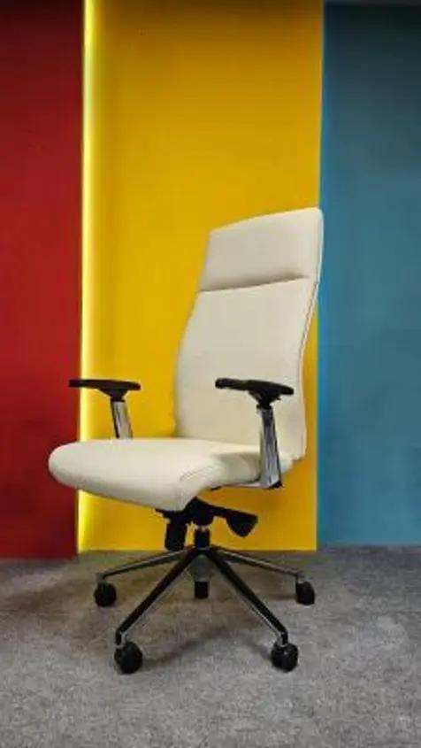 Bu kaşangy oturgyç klassyk dizaýny we häzirki zaman ergonomik standartlaryny özünde jemleýär. Ol rahatlygy, abraýy we berkligi gadyrlanýanlar üçin döredilendir. Ak reňkli (krem) ýumşak deri örtügi hromlanan detallar bilen utgaşyp, iş otagyna saldamly we professional görnüş berýär. Gaplama materialy: Ýokary hilli eko-deri. Ol el bilen degniňde ýumşak, aşalmalara çydamly we arassalamak üçin aňsatdyr. Ergonomika: Beýik arkalygy, ýörite gapdal goldawy we ýumşak kelle goýulýan ýassygy bütin günüň dowamynda oňurga we boýna agram düşürmezden rahat işlemäge mümkinçilik berýär. Gollary: Ýumşak eko-deri örtükli metal gollary elleriň amatly ýagdaýda bolmagyny üpjün edýär. Mehanizmleri: Beýikligi sazlaýan (gazlift) we yranma mehanizmi bilen üpjün edilen, bu bolsa oturgyjy özüňize görä sazlamaga mümkinçilik berýär. Esasy: Ýokary berklikdäki metal hromlanan bäş aýakly gurnama uly agramlara durnuklydyr. Hereketliligi: Bäş sany berk we togalak tigirçekler islendik poluň ýüzünde rahat we sesiz süýşmegi üpjün edýär.