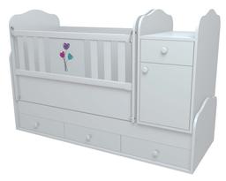 Transformator krowat. Çagalar krowady – komodly we yrgyldadyjy mehanizmly transformatordyr. Krowatyň aşagynda teleskopik ugrukturyjylar bilen 3 sany çekme bar, olar az ýerde çaganyň goşlaryny we oýunjaklaryny amatly ýerleşdirmäge mümkinçilik berýär. Krowaty çaga üçin ýazuw stoluna öwrüp bolýar. Gapdalynda çaganyň arlygyny çalşyrmak üçin ýeri bolan komod ýerleşýär. Konstruksiýanyň ähli elementleri ýokary berklikdäki LDSP-den öndürilen. Çaga aňsat ýetmek üçin gapdal germeji aşak düşürilýär. (Nagyşsyzy hem bar.) Keseleýin yrgyldadyjy mehanizmly maýatnik. Ölçegleri (U.x I.x B.) – 173,2 х 66,0 х 110,7 sm Çaga ýatylýan ýeriniň ölçegi – 60 х 120 sm Ýetginjek ýatylýan ýeriniň ölçegi – 60 х 170 sm Tumbanyň ölçegi (I.x B.) – 41,6 х 66,0 sm Agramy - 85 kg. Matras komplekta girmeýär!