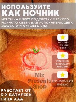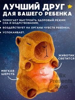 Ýumşak, dem alýan "Kapibara" uky oýunjagy, 26 sm Dem alýan ýumşak Kapibara doldurylan haýwan iň gowy uklama ýoldaşydyr! Bu ýumşak, dem alýan kapibara bilen rahat we asuda atmosfera dörediň! Bu owadan ýumşak oýunjak dem alyşy gaýtalaýar, ýagtylandyrýar we saz çalýar, çagaňyzyň çalt uklap galmagyna we özüni howpsuz duýmagyna kömek edýär. Çagaňyz üçin ýumşaklyk we rahatlyk Ýumşak ýumşakdan ýasalan bu oýunjak gujaklamak üçin ajaýypdyr. Onuň ýumşak teksturasy çagany rahatlandyrýar, rahatlyk we howpsuzlyk duýgusyny döredýär. Saz we yşyk režimi Kapibara 30 minutlap ýumşak saz çalýar, otagy parahatçylyk we sazlaşyk bilen doldurýar. Onuň ýumşak şöhlesi ony ajaýyp gijeki çyra öwürýär we rahat atmosfera döredýär. Realistik dem alyş Oýunjak hakyky öý haýwanynyň dem alyşyny gaýtalap, garnyny ritmik hereketlendirýär. Bu çaganyň hakyky tüýli dosty bilen ýaly rahat duýmagyna kömek edýär. Bäbekler we uly ýaşly çagalar üçin ajaýyp sowgat
