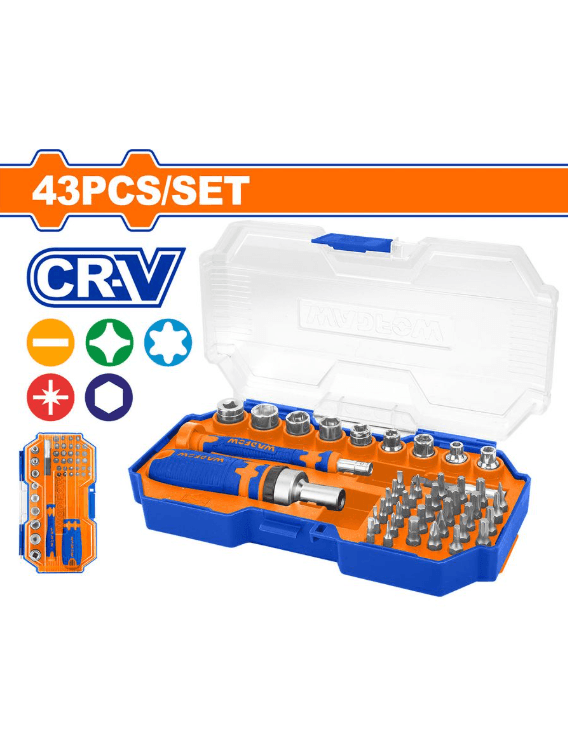 88 sany Treşotka mehanizmli towlaýjylar we bitler toplumy Materialy: Cr-V 45 sany T-görnüşli sapy bolan treşotka we towlaýjy toplumy (WSS8B45): 36 sany 1/4"x25 mm towlaýjy bitleri: SL3 SL4 SL5 SL6 SL6 SL7 PH0 PH1 PH1 PH2 PH2 PH2 PH3 PZ0 PZ1 PZ2 PZ3 T8 T9 T10 T15 T20 T25 T27 T30 T40 H2 H2.5 H3 H4 H5 H6 S0 S1 S2 S3 6 sany 1/4"x20.5 mm golowka: 5 6 7 8 9 10 mm 1 sany adapter 1 sany 1/4"x138 mm bit saklaýjy 1 sany T-görnüşli treşotka sapy 43 sany treşotka mehanizmli towlaýjy toplumy (WSS8B43): 18 sany 1/4"x25 mm towlaýjy bitleri: SL4 SL5 SL6 PH0 PH1 PH2 PH3 PZ1 PZ2 T10 T15 T20 T25 T27 H3 H4 H5 H6 12 sany 4x28 mm takyk (presizion) towlaýjy bitleri: SL1.5 SL2 SL2.5 PH000 PH00 T6 T7 T8 Y2 U2.6 Five Star0.8 Five Star1.2 1 sany 4-6 mm (25 mm) bitler üçin adapter 9 sany 1/4"x20,5 mm golowka: 4, 5, 6, 7, 8, 9, 10, 11, 12 mm 1 sany 1/4"x50 mm bit saklaýjy 1 sany özboluşly dizaýnly treşotka sapy (1/4"x115 mm) 1 sany özboluşly dizaýnly sap (4x113 mm) Plastik gutuda gaplanan