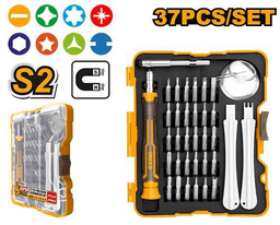 Bitleriň tutawaç-saby 4×60 mm uzaldyjy (magnitli) 30 sany 4×28 mm takyk (presizion) bitler: Göni (SL): 1.5 / 2 / 2.5 / 3 / 3.5 / 4 Atanaklaýyn (PH): 000 / 00 / 0 / 1 Torx (T): 4 / 5 / 6 / 7 / 8 / 9 / 10 / 15 / 20 Altyburçly (HEX): 0.9 / 1.3 / 1.5 / 2 / 2.5 / 3 / 4 Ýörite: Y2, U2.6 Iki sany ýyldyzjygy (Five-Star): 0.8 mm we 1.2 mm Ekranlary aýyrmak üçin wakuum sorujy (prisoska) Korpuslary açmak üçin plastik üçburçluk Iki sany plastik galdyryjy (ryçag) SIM-karty çykarmak üçin iňňe Häsiýetnamalary Görnüşi: takyk atgyfçylar (otwertkalar) toplumy Esbaplaryň sany: 37 Bitleriň materialy: S2 polat (ýokary durnuklylyk) Formaty: dury gapakly we fiksatorly keýs Niýetlenişi: ykjam tehnikalary we elektronika gurallaryny abatlamak Toplumyň agramy: takmynan 250 g Öndüriji: INGCO Öndürilen ýurdy: Hytaý