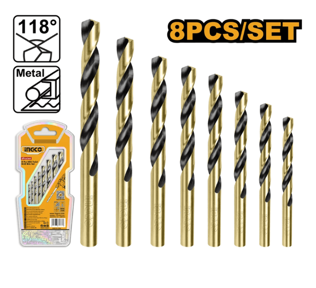 INGCO AKDB0801 metal üçin burgy toplumy çalt kesiji polatdan (HSS) ýasalandyr. Toplumda şu ölçeglerdäki 8 sany burgy bar: 2X49, 3X61, 3X61, 4X75, 4X75, 5X86, 6X93, 8X117 mm. Silindr görnüşli sakgyçly (hwestowikly). Blisterde gaplanan.