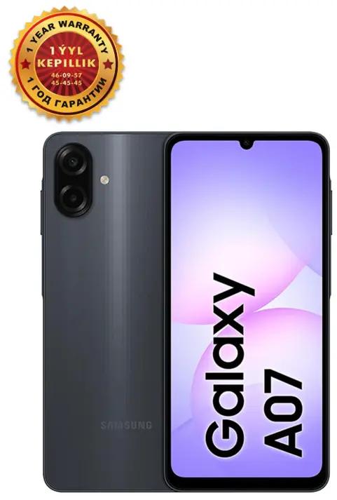 Smartfon Samsung Galaxy A07 6/128 GB, Gara — bu başlangyç derejeli, ygtybarly enjam. Displeý: 90 Hz täzelenme ýygylygy bolan 6,7 dýuýmlyk ekran bilen enjamlaşdyrylan. Matrisa görnüşi — PLS LCD, çözgüdi bolsa HD+ (720 x 1600 piksel). Öndürijilik: Sekiz ýadroly MediaTek Helio G99 prosessorynda işleýär. Ýat: Konfigurasiýa 6 GB operatiw ýady we 128 GB içki ýatgyny öz içine alýar. Şeýle hem, microSDXC karty arkaly giňeltmek mümkinçiligi bar. Kamera: Esasy kameranyň çözgüdi 50 MP, öň kameranyňky bolsa 8 MP. Batareýa: 5000 мАч kuwwatly litiý-ion batareýasy uzak wagtlap işlemegi üpjün edýär. Goşmaça: Iki SIM kartyny goldaýar, gapdal tarapdan barmak yzy skaneri we IP54 standarty boýunça tozan we suw damjalaryndan goragy bar. Enjamyň agramy 184 g. Operasion ulgam: One UI 7 interfeýsi bilen Android 15 dolandyryşynda işleýär.