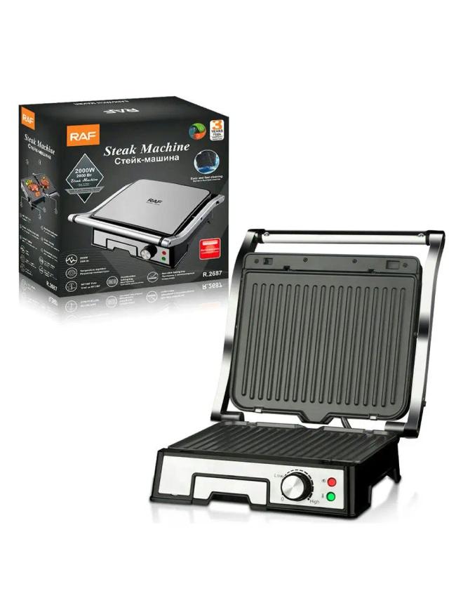 Gril pressi ýa-da elektrik panjarasy diýlip hem bilinýän biftek, biftek bişirmek üçin niýetlenen aşhana enjamy. Modeli: R.2687 Kuwwaty: 2000W Elektrik naprýaženiýasy: 220-240V