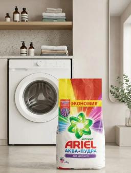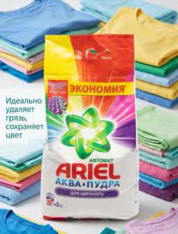 Ariel Color awtomat kir ýuwujy maşynlarda reňkli eşikleri ýuwmak üçin niýetlenen ýokary hilli serişdedir. Onuň täze «Akwapudra» tehnologiýasy suw bilen galtaşanda derrew ereýär, matanyň süýümlerine çuň aralaşýar we kyn tegmilleri matanyň ýüzünde yz galdyrmazdan aňsatlyk bilen aýyrýar. Serişde eşiklerde uzak wagtlap galýan adaty terlik ysyna eýedir. Düzüminde hlorly agardyjy maddalar ýokdur, bu bolsa matanyň süýümlerini könelmekden goraýar we reňkleriň ilkinji günki ýaly ýarky galmagyny üpjün edäýär. 3 kg-lyk gap ortaça agramlykdaky (4-5 kg) kirler üçin takmynan 20 gezek ýuwmak üçin ýeterlikdir.