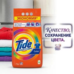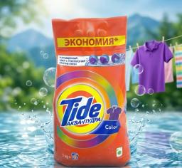 Tide Color awtomat kir ýuwujy maşynlarda reňkli eşikleri ýuwmak üçin niýetlenen ýörite serişdedir. Onuň täze «Akwapudra» tehnologiýasy suw bilen galtaşanda derrew ereýär we hatda pes temperaturalarda-da (30°C-den başlap) matanyň ýüzünde yz galdyrmazdan işläp başlaýar. Serişde eşiklerde uzak wagtlap galýan ýakymly «Alp daglarynyň terligi» ysyna eýedir. Onuň düzüminde hlorly agardyjy maddalar ýokdur, bu bolsa matanyň süýümlerini könelmekden goraýar we köp gezek ýuwlandan soň hem reňkleriň ýarkylygyny saklamaga kömek edýär. 3 kg-lyk gap ortaça agramlykdaky (4-5 kg) kirler üçin takmynan 20 gezek ýuwmak üçin ýeterlikdir.