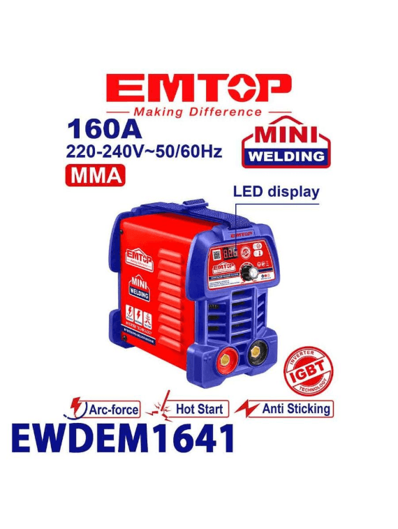 EMTOP EWDEM1641 kebşirleýiş enjamy — el bilen dugaly kebşirlemek (MMA) üçin niýetlenen inwertor enjamydyr. Käbir häsiýetnamalary: Boş işledilýän naprýaženiýesi: 220 W; Elektrodyň minimal diametri: 1,6 mm; Elektrodyň maksimal diametri: 3,2 mm; Kebşirleýiş görnüşi: inwertor.