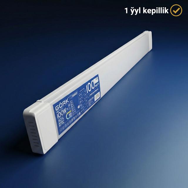 100 Wt kuwwatyndaky G.Ö.R.K. çyzykly yşyklandyryjysy — maksimal ýagtylyk talap edilýän obýektler üçin niýetlenen önümçilik derejeli çözgütdir. Ýokary kuwwaty we uzyn Batten korpusy saýasynda, ol uly meýdançalary netijeli yşyklandyrýar hem-de köp energiýa sarp edýän adaty uly çyralaryň ýerini tutýar. Sowuk ak ýagtylyk (6500K) kämil görünijiligi üpjün edip, işe ünsüňi jemlemäge ýardam edýär. Bu çyra iri ammarlar, gurnama sehler, ýapyk sport meýdançalary we gipermarketler üçin iň amatly saýlowdyr. Kuwwaty: 100 Wt (professional ýagtylyk derejesi). Korpusyň görnüşi: Batten (çyzykly, güýçlendirilen). Ýagtylyk öwüşgini: 6500K (sowuk gündiz ýagtylygy). Aýratynlyklary: Uzak wagtlap dowamly işlemäge durnuklylyk, netijeli sowadyş we bada-bat ýanmak.